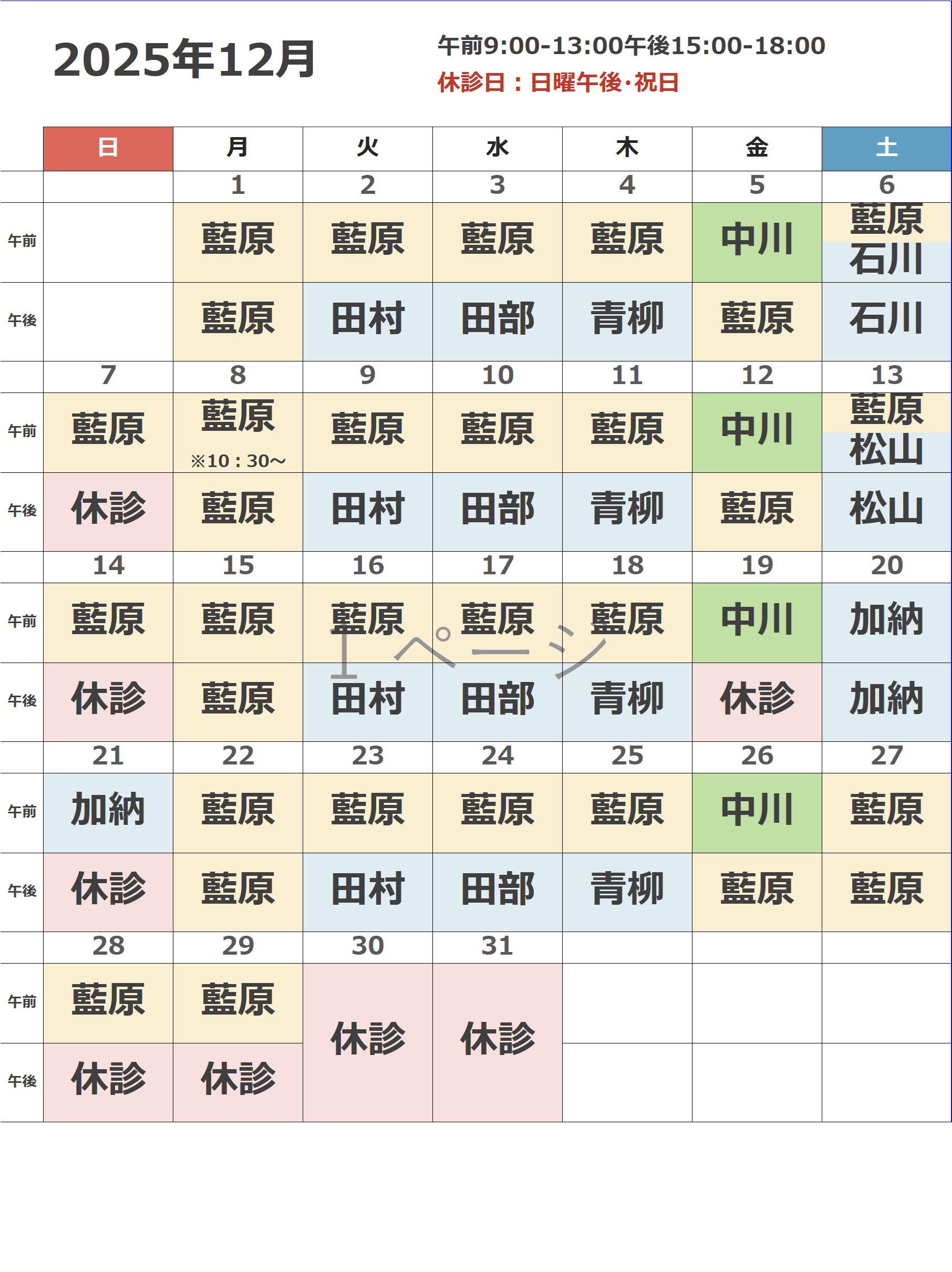 午後 藍原院長 外来休診